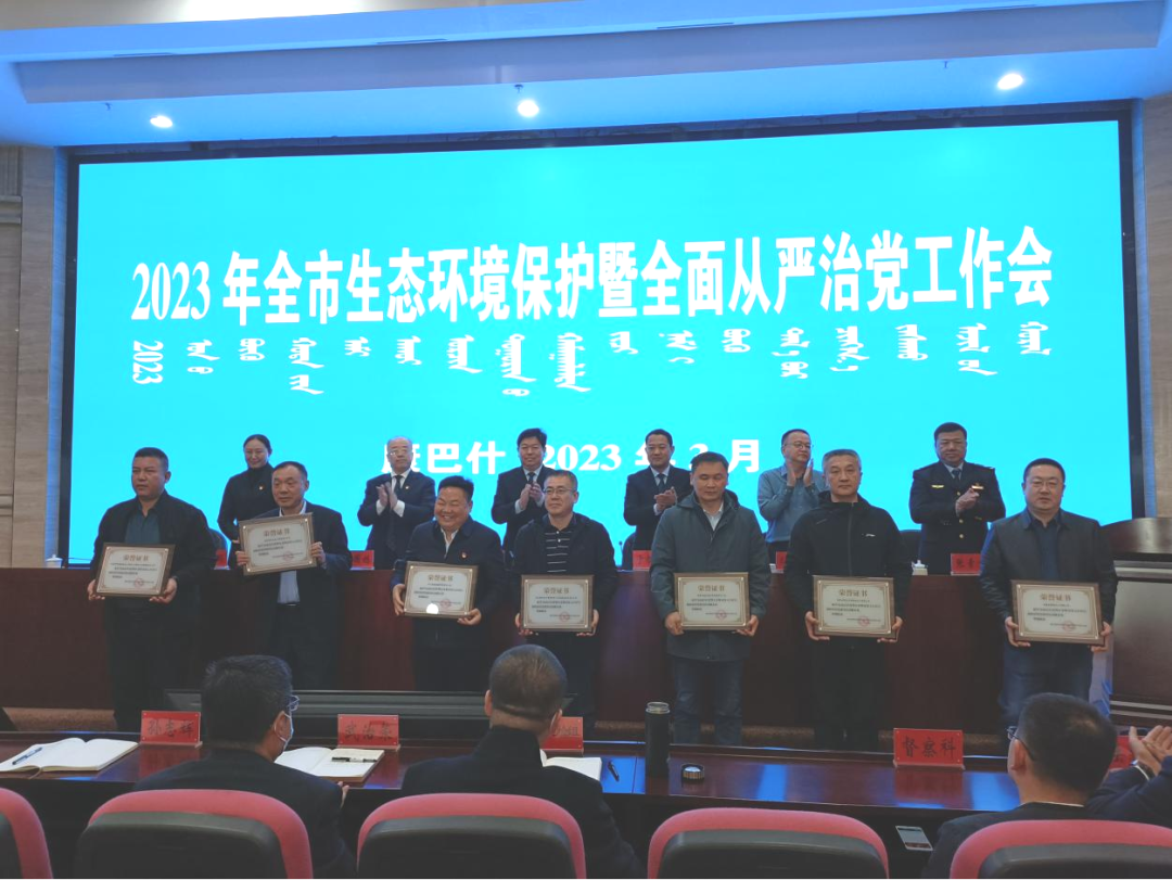 市生态环境局副局长玛喜毕力格宣读了《关于表彰2022年度鄂尔多斯市深入打好污染防治攻坚战突出贡献企业的决定》,并表彰了相关企业。会上,局领导班子还向系统内从事生态环境工作超过三十年的7名干部职工颁发了纪念章。